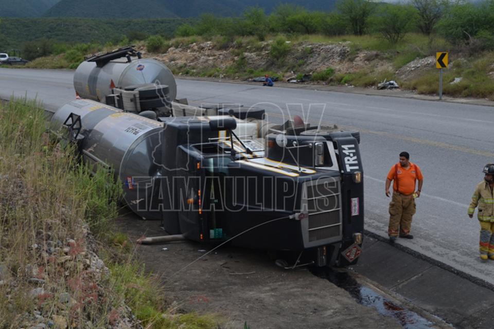 Vuelca tráiler cargado con combustoleo en la Rumbo Nuevo