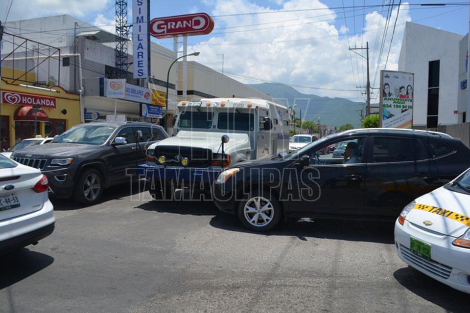 Camioneta de valores choca contra auto en Ciudad Victoria
