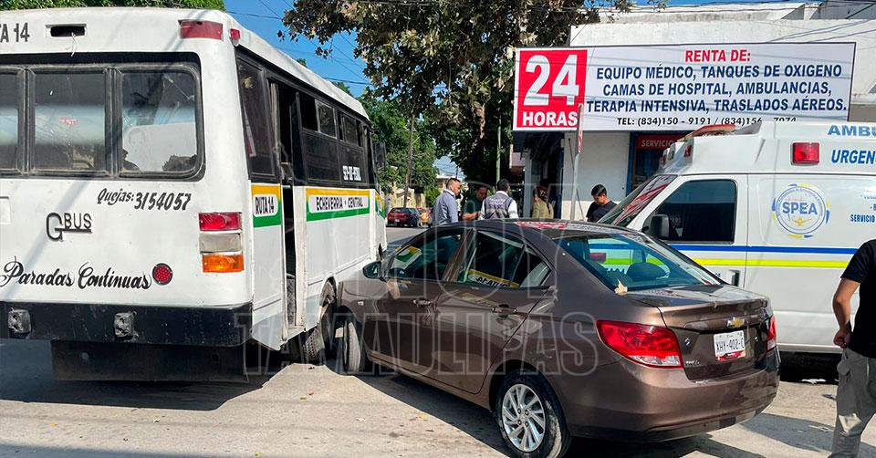 Microbús “arremanga” parte frontal de auto que se pasó alto en Ciudad Victoria