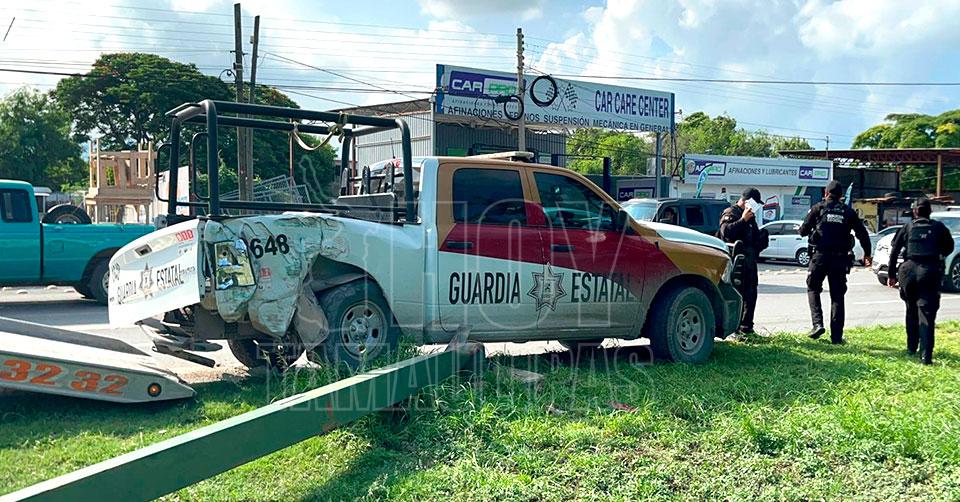 Estatales sacan patrulla del taller y la chocan con luminaria en Ciudad Victoria
