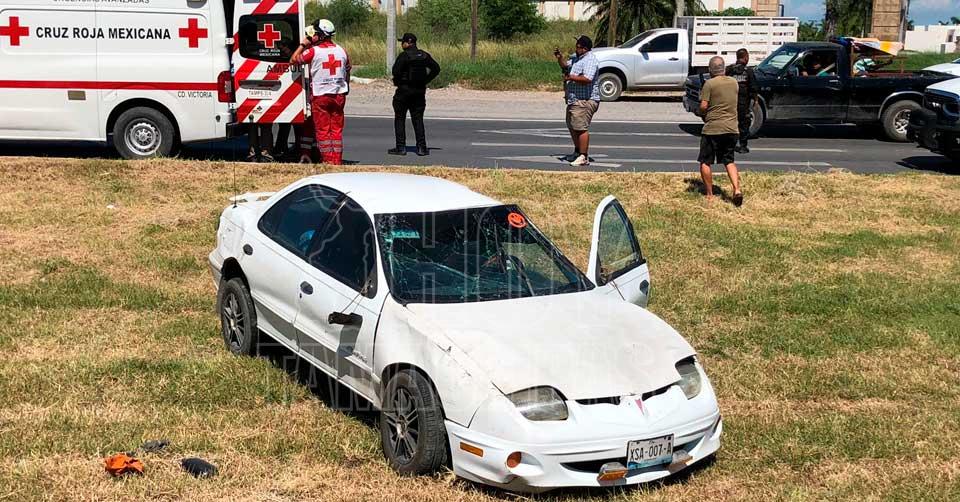 Vuelca auto con vendedores de chile piquín en el Libramiento Naciones Unidas en Ciudad Victoria