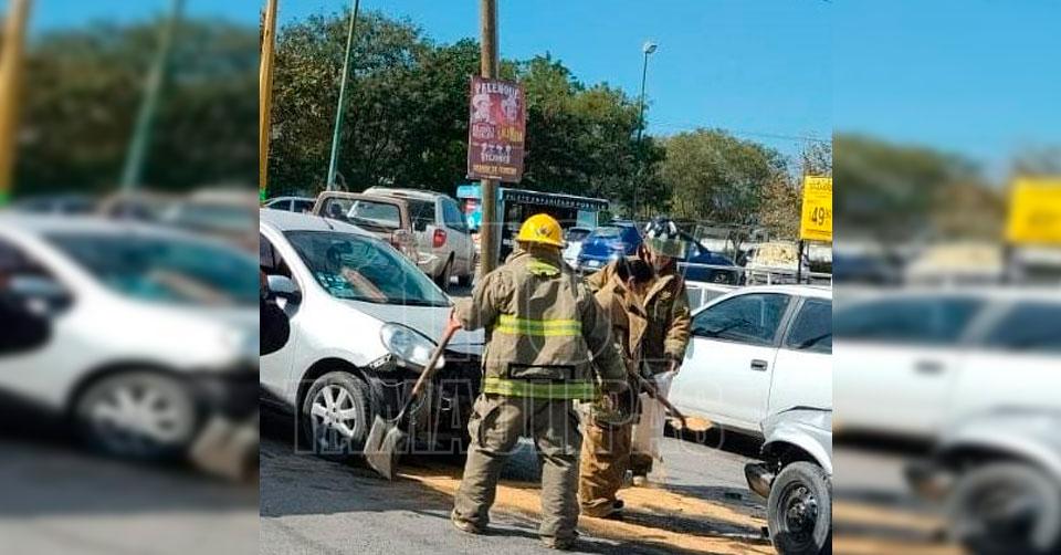 Intervienen bomberos por aceite derramado tras choque en Victoria