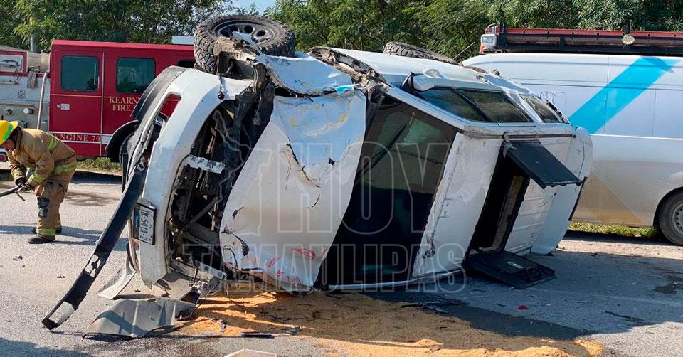 Camioneta blindada de Seguridad Pública causa choque y vuelca en la Victoria-Monterrey