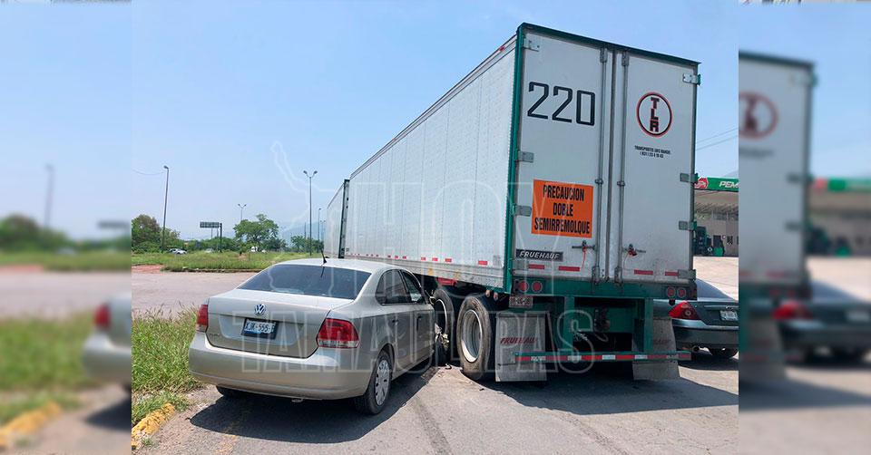 Conductor intentó rebasar y terminó “ensartado” en un tráiler en Ciudad Victoria
