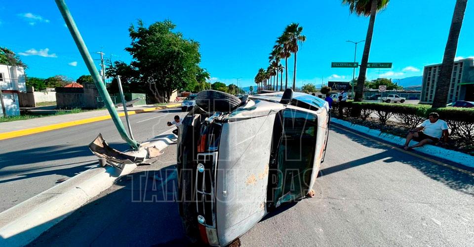 Vuelca camioneta tras chocar contra luminaria en Ciudad Victoria