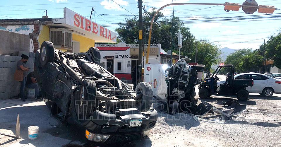 Chocan y vuelcan en Ciudad Victoria: Dos lesionados