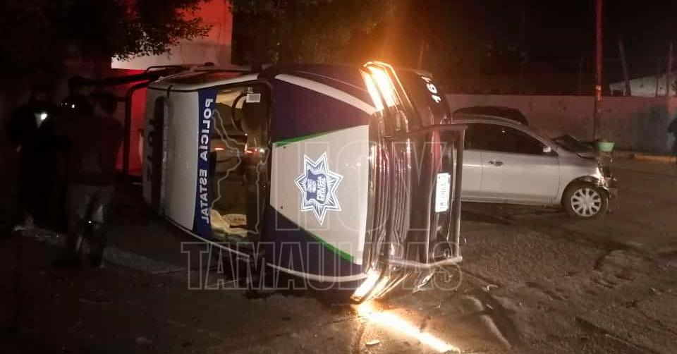 Patrulla de la Policía Estatal se pasó alto, chocó y volcó en Ciudad Victoria