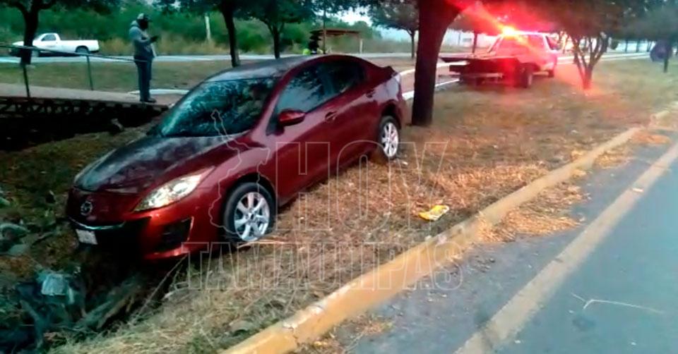 Falla en la suspensión lo saca del camino y se sube a camellón en Ciudad Victoria