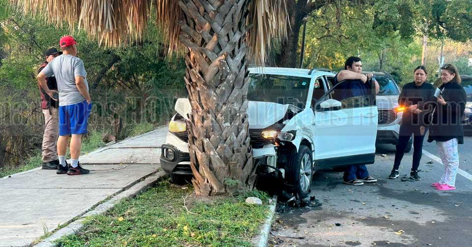 Cambia de carril y provoca choque en Victoria; camioneta terminó contra palmera