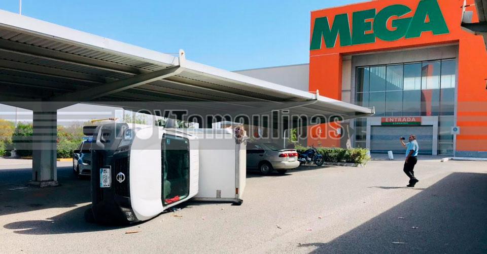 Vuelca camioneta en estacionamiento de la Mega en Ciudad Victoria