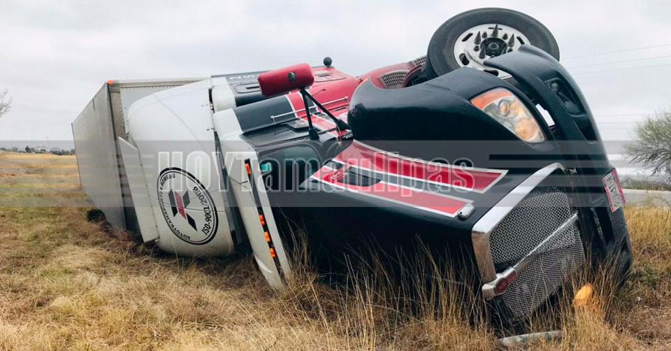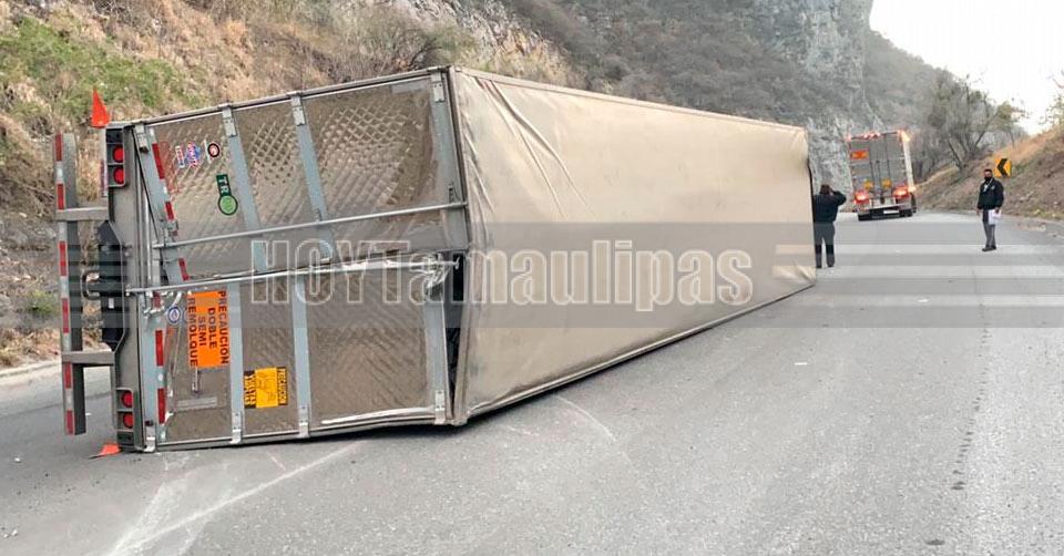 Volcadura de tráiler deja a madre e hijo lesionados en la carretera Victoria-Matamoros