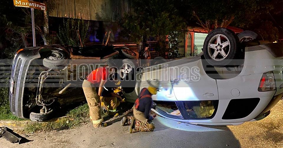 Chocan y vuelcan dos vehículos en Ciudad Victoria; un lesionado atrapado