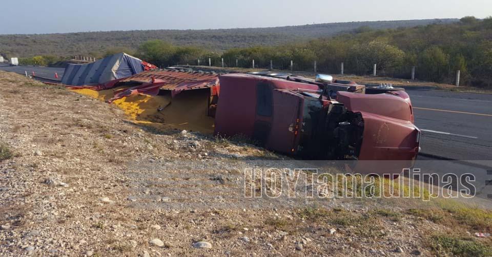 Vuelca tráiler cargado con sorgo en la carretera Zaragoza-Victoria