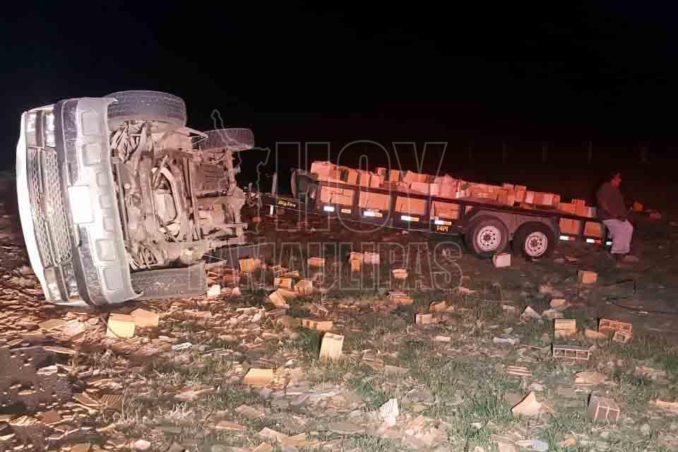 Vuelca camioneta con ladrillo de adobe en la Zaragoza-Victoria