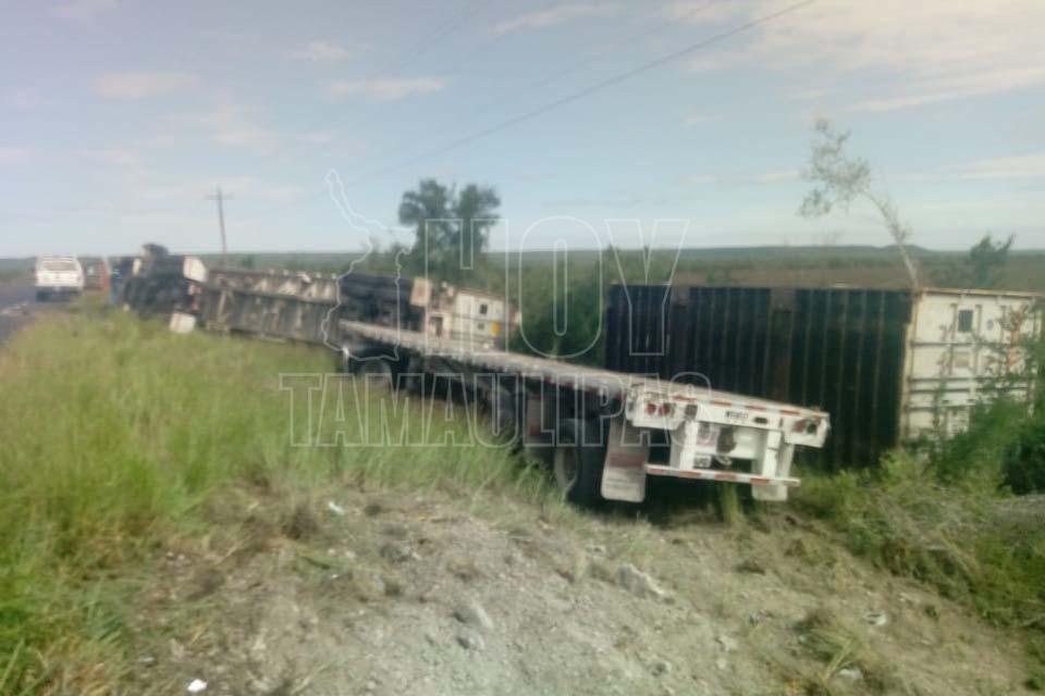 Vuelca tráiler cargado con vigas de acero en la Victoria-Matamoros