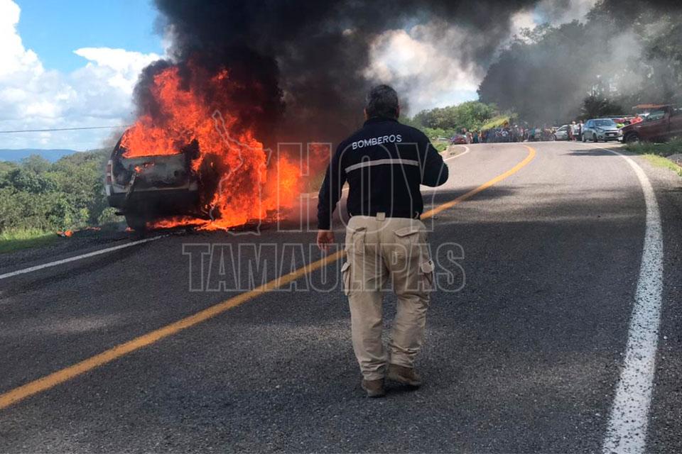 Fuego consume camioneta en el Balcón de Moctezuma en Victoria