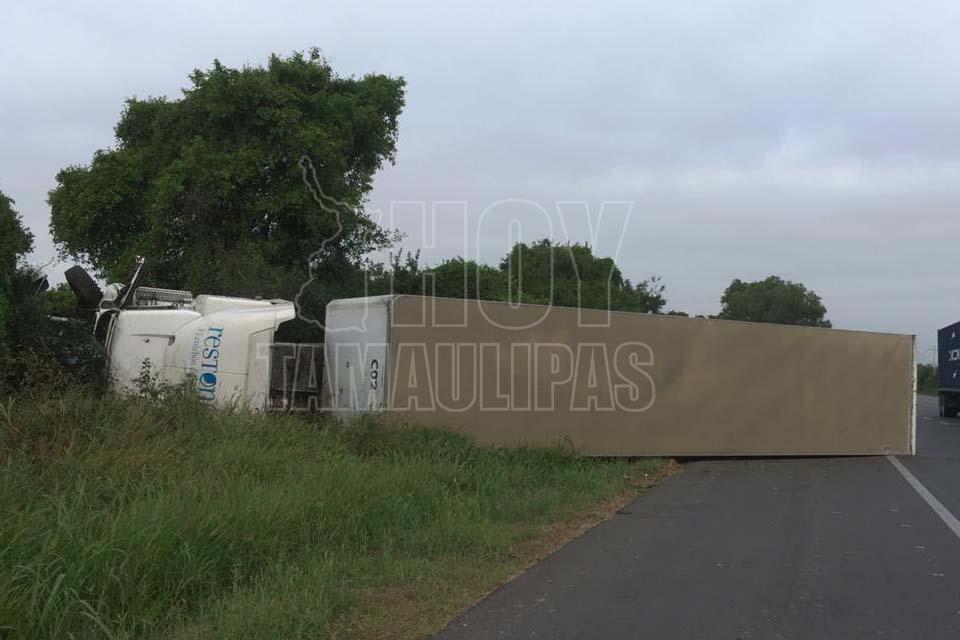 Vuelca tráiler cargado con colchones en la carretera Victoria-Monterrey