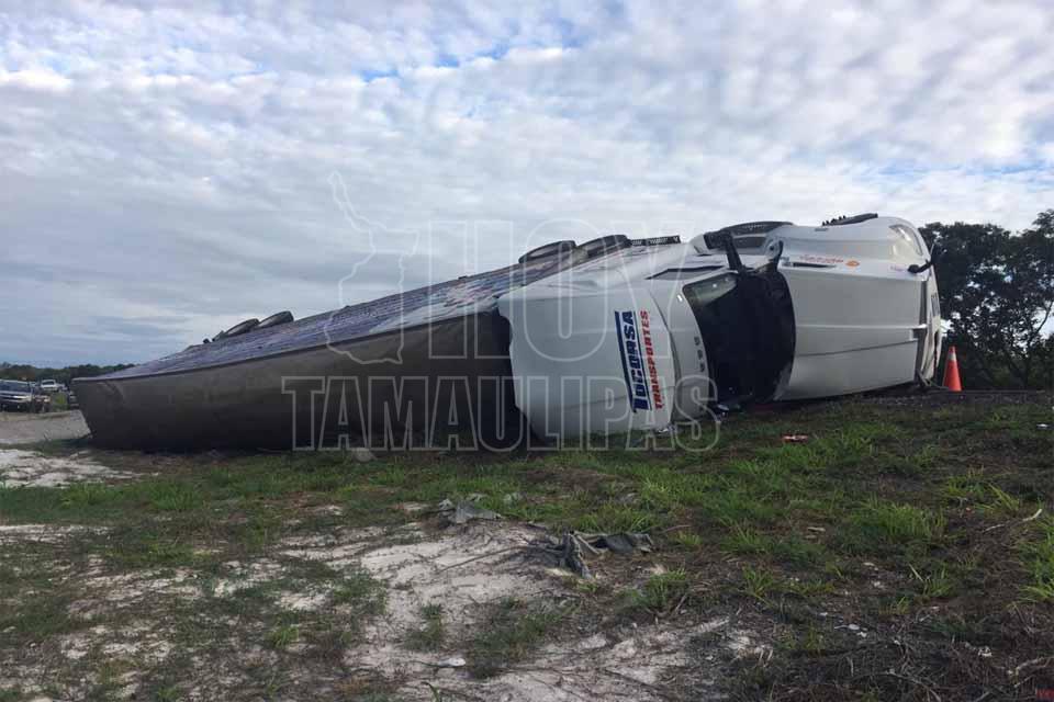 Vuelca tráiler cargado con carne de pollo en la carretera González-Zaragoza