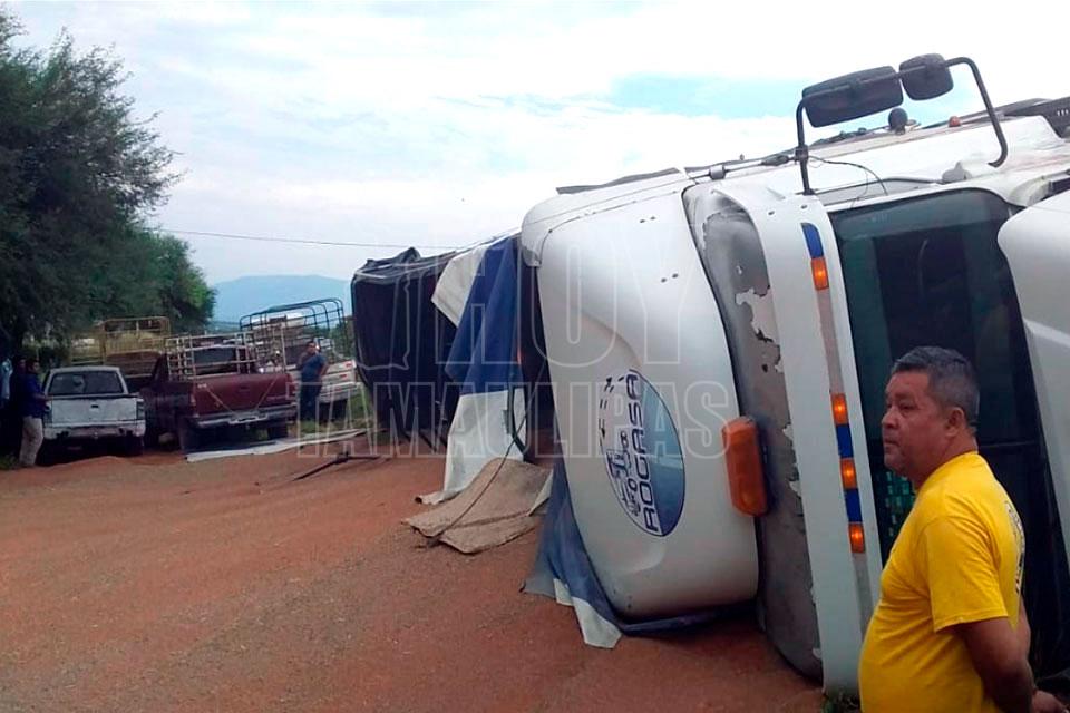 Rapiñan sorgo tras volcadura de tráiler en la Rumbo Nuevo