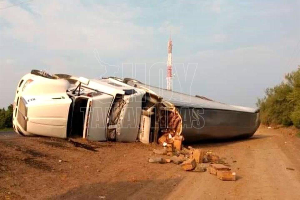 Vuelca trailer cargado con pepino en la carretera Victoria- Matamoros