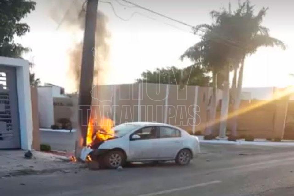 Choca contra poste y se incendia su vehículo en Ciudad Victoria