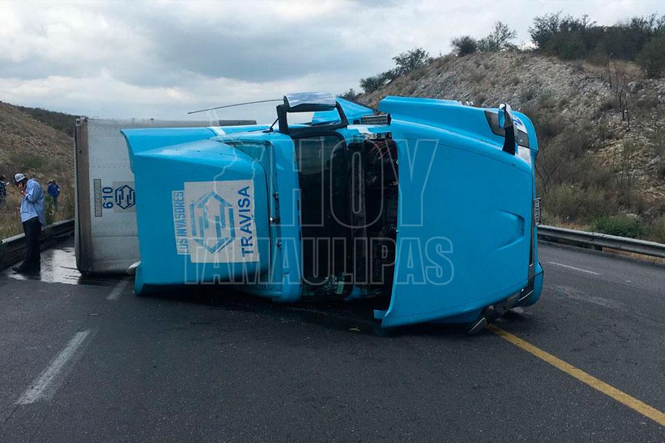 Vuelca tráiler cargado con triplay en la Rumbo Nuevo