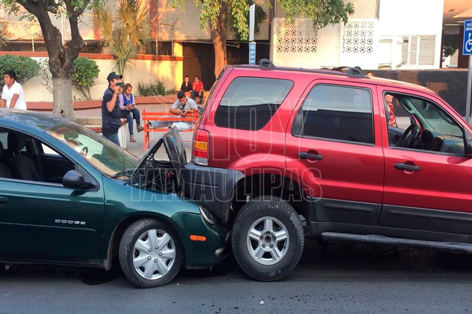 Camioneta choca y se sube al cofre de vehículo en Ciudad Victoria