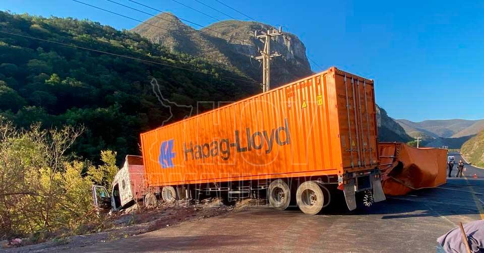 Trailero a punto de caer a un barranco cerca de Ciudad Victoria