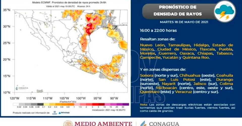 Fuertes lluvias, descargas eléctricas, granizadas y tornados, varios estados; calor en otros