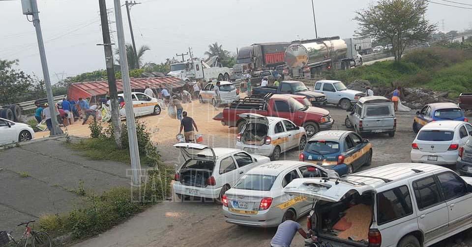 Vuelca tráiler con toneladas de maíz y hay rapiña en acceso a Tampico