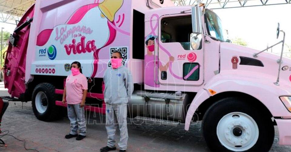 Camiones recolectores de basura en Querétaro se suman a campaña contra cáncer de mama