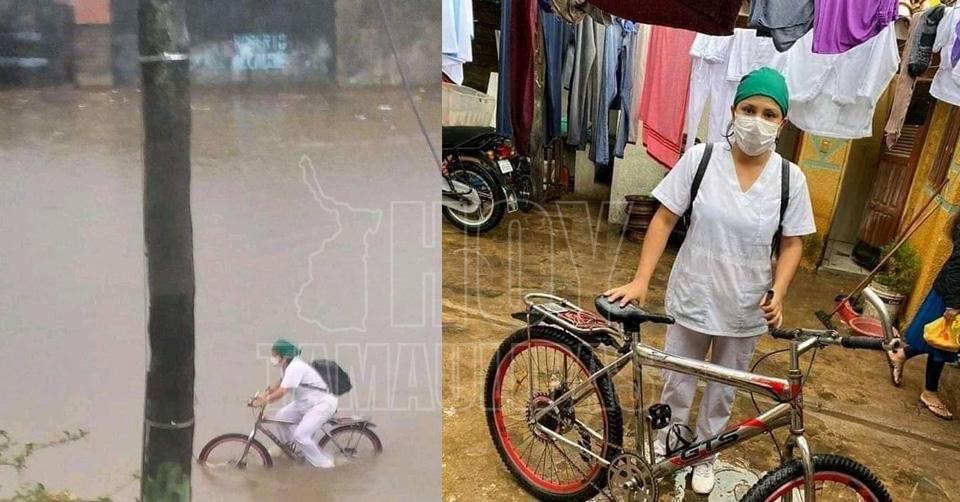 Viral; enfermera recorre las calles inundadas en bicicleta para ir a su trabajo