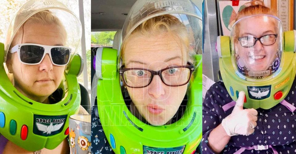 Mujer usa casco de Buzz Lightyear para salir a comprar nuggets para su hijo