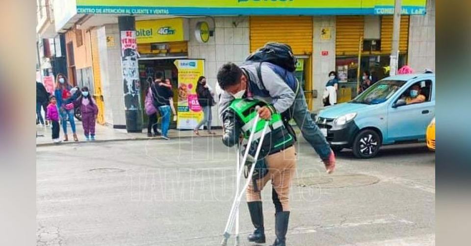 Policía carga a hombre discapacitado para cruzar la calle en Perú