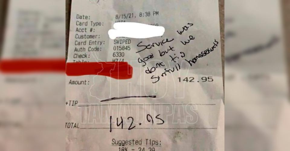 “No damos propina a pecadores”, le escriben a mesero gay en el ticket de pago