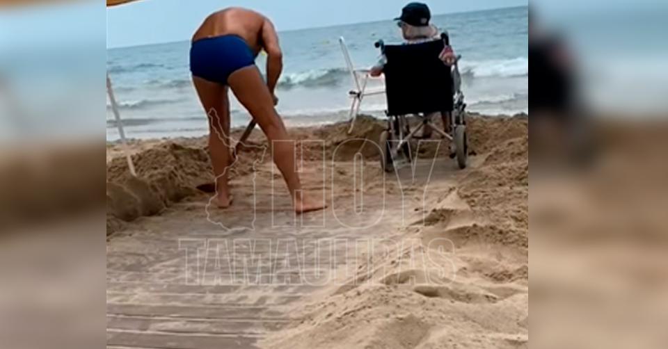VÍDEO: Con pala hombre quita la arena para que su mamá en silla de ruedas sienta el mar en los pies