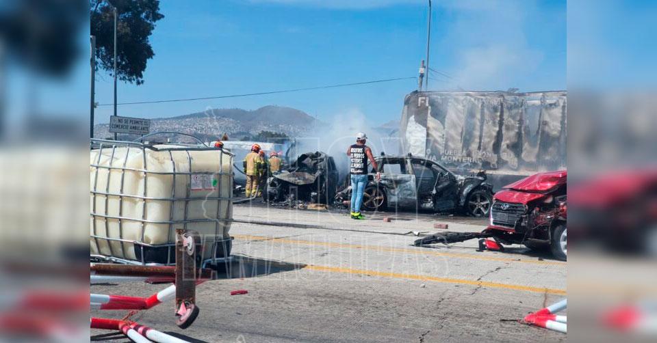 Camión sin frenos se lleva 12 autos y provoca incendio en caseta de la México-Puebla; hay 10 muertos