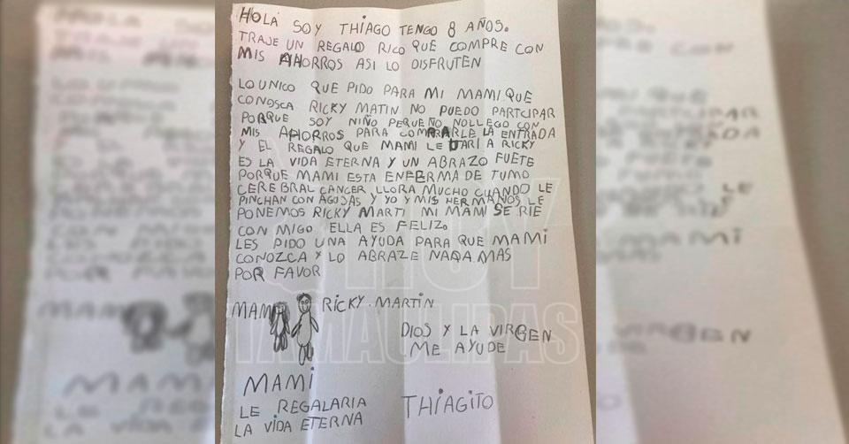 Niño escribe carta para que su mamá enferma conozca a Ricky Martin