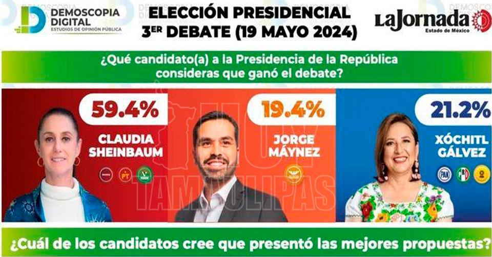 Sheinbaum alcanza amplia victoria en el tercer debate, señalan encuestadoras