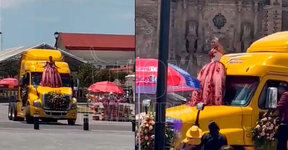 Sorprende quinceañera por llegar en tráiler a su festejo