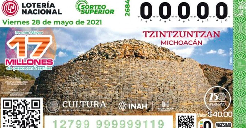 Revelan billete de la Lotería Nacional con las Yácatas de Tzintzuntzan