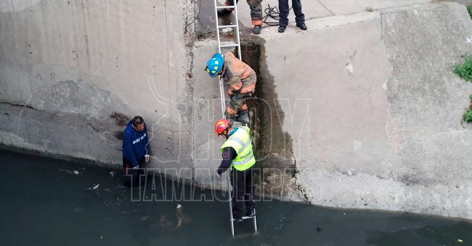 Salvan rescatistas a ciclista que cayó a canal de aguas negras en Edomex