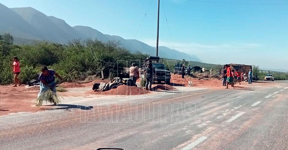 Vuelca tráiler cargado con sorgo en la Tula-Victoria; hubo rapiña