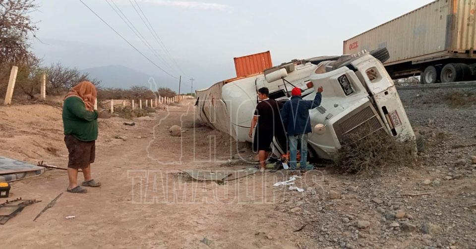 Tráiler la “empuja” y vuelca en la carretera Tula-Victoria; se salvó de morir