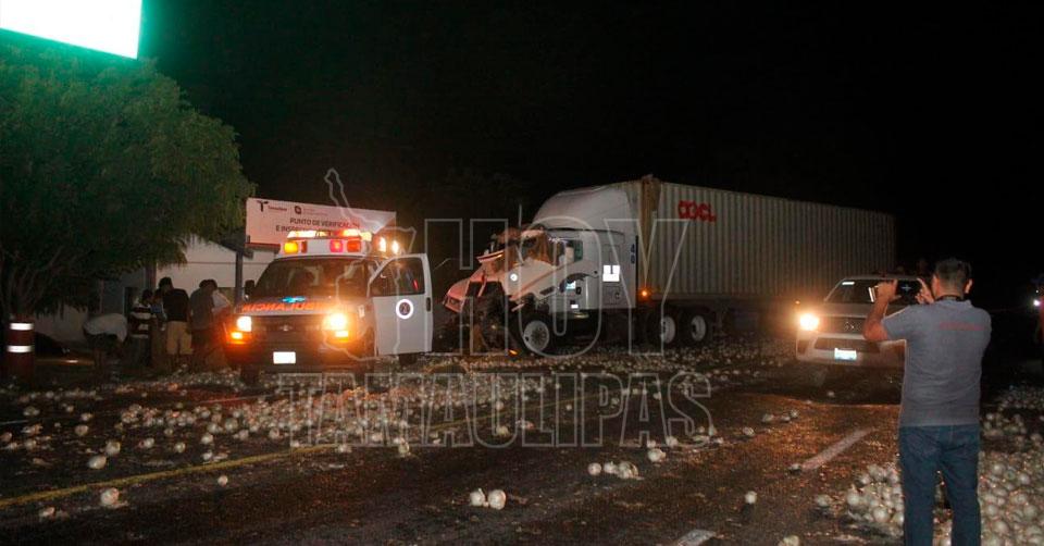Dos lesionados y rapiña de cebolla dejó choque de tráileres en El Mante