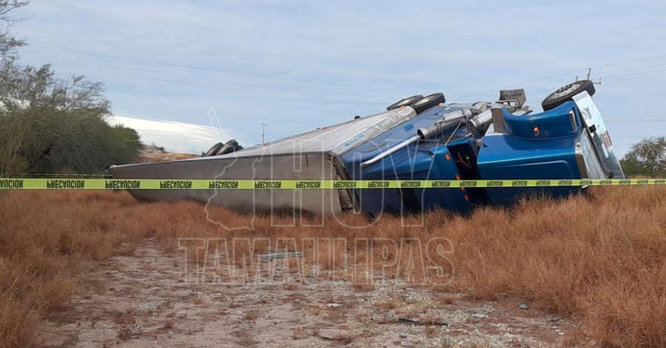 Vuelca tráiler doble remolque en la carretera Victoria-Matamoros