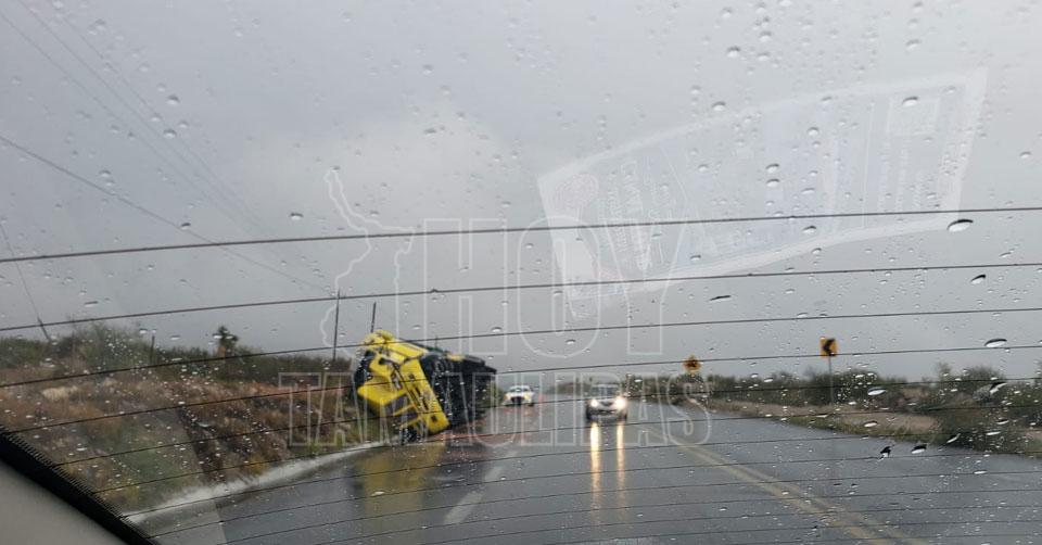 Vuelca tráiler cargado con sorgo en la carretera Tula-Victoria