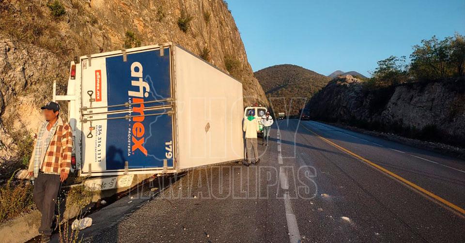 Vuelca camión de paquetería en la carretera Tula-Victoria; dos lesionados