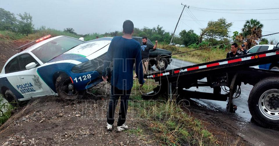 Derrapa patrulla de la estatal y cae a canal en Xicoténcatl