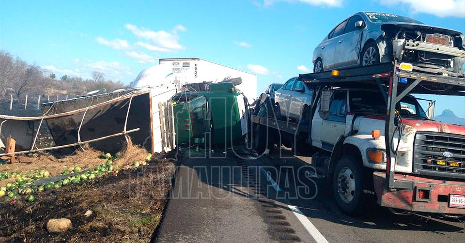 Vuelca tráiler cargado con mango en la carretera Victoria-Matamoros